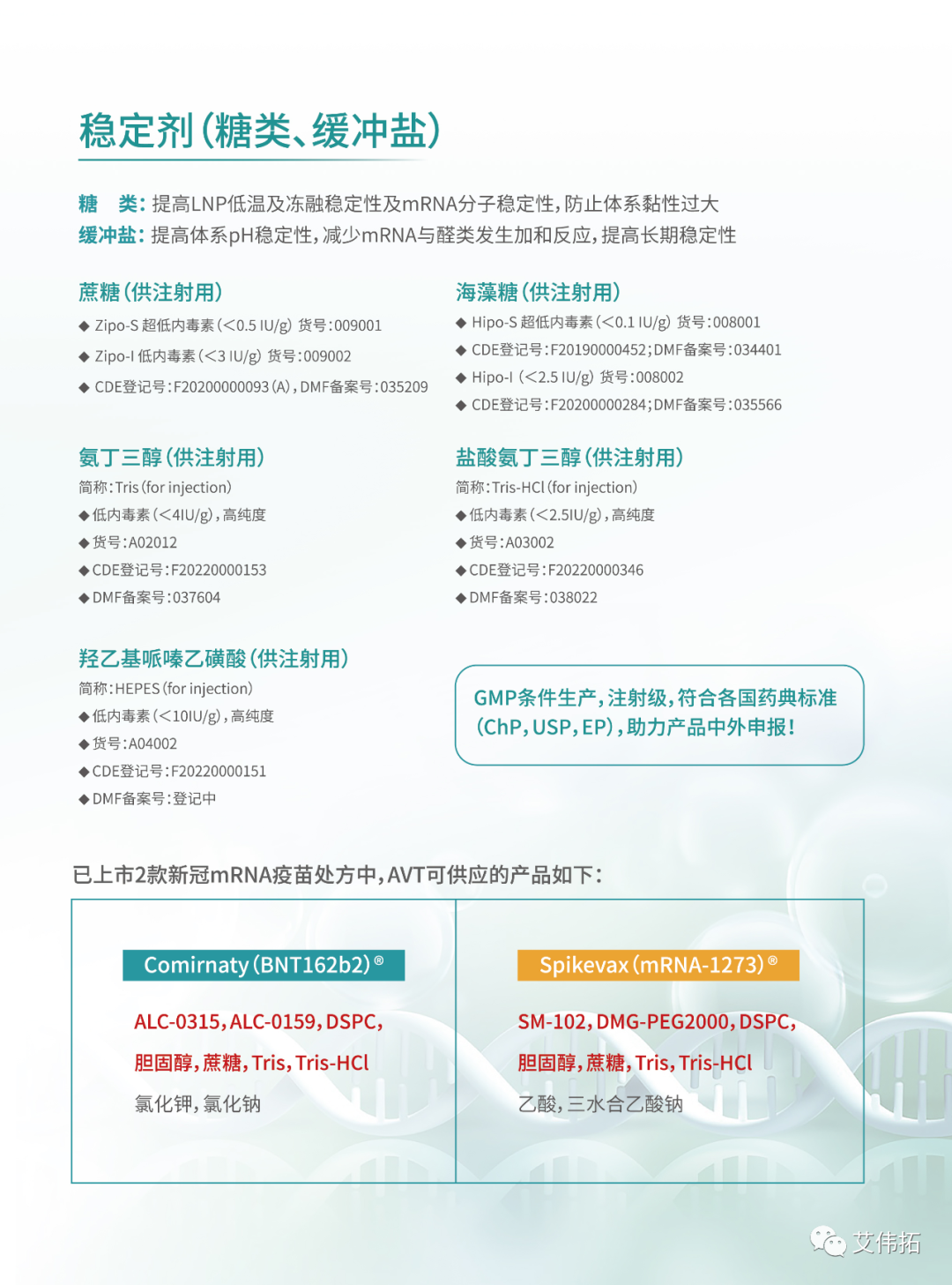艾偉拓16年來始終專注于**注射級輔料,長期穩(wěn)定供應(yīng)注射級海藻糖、蔗糖、TRIS/TRIS-HCl、HEPES等生物制劑輔料,具有GMP條件生產(chǎn),中美雙報,供注射用,**內(nèi)**,DNase& RNase free,符合國際主流藥典標(biāo)準(zhǔn),現(xiàn)貨快速供應(yīng)等優(yōu)勢,助力mRNA疫苗等核酸制劑的研發(fā)生產(chǎn)與中外申報!