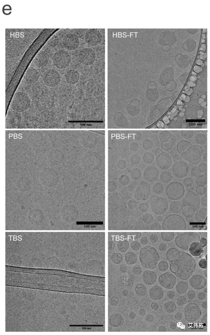 與新鮮LNPs相比,HEPES中的LNPs在凍融后出現獨特的沙漏狀結構,尺寸略大(見下圖e)。在LNPs周圍形成的水泡似乎缺乏mRNA,這可能表明HEPES可以影響mRNA周圍脂質的堆積,例如,HEPES可以促進脂質與mRNA之間更強的靜電相互作用——HEPES LNPs的zeta電位是真正的中性的,而PBS和Tris LNPs具有?2至?5 mV的輕微負電荷,這可能表明當HEPES存在時,mRNA電荷的中和作用更有效。