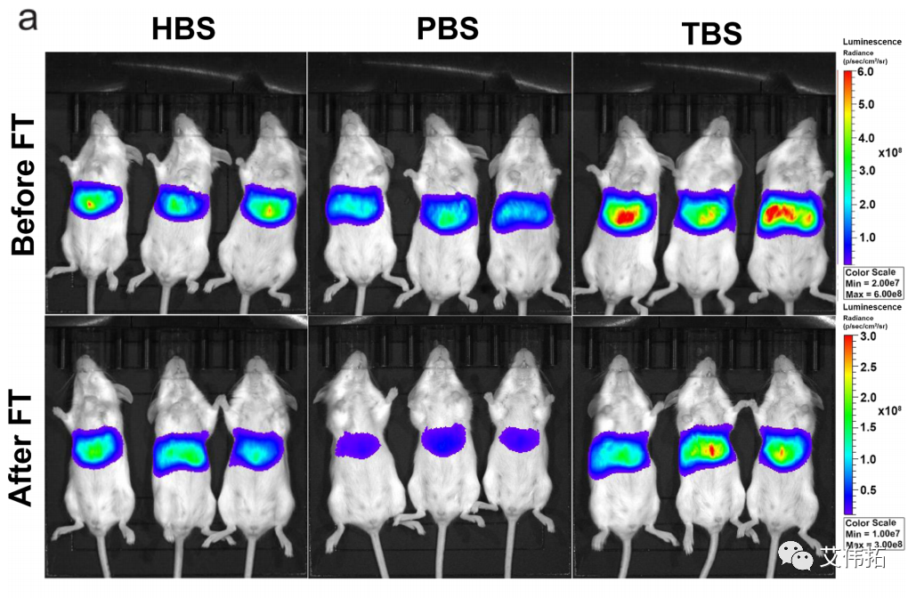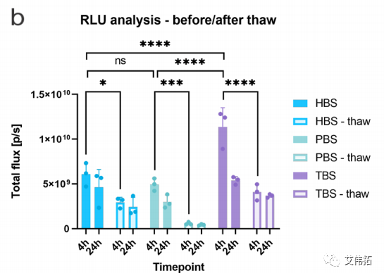 通過**成像,探索了不同緩沖體系mRNA-LNP在體內的表達情況。將HEPES、Tris和PBS LNPs靜脈注射到年齡匹配的雌性BALB/c小鼠中,比較熒光素酶的表達水平和**特異性。在注射后4和24 h時間點測量新鮮和解凍的LNPs的生物發光信號。