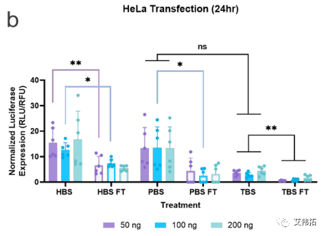 然而,緩沖液導致了不同程度的轉染損失。對于給藥后4小時的FT組,HEPES顯示總通量減少約2倍,Tris顯示減少約3倍,PBS (LNP配方中*常見的緩沖液)導致總通量減少近9倍。