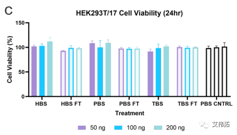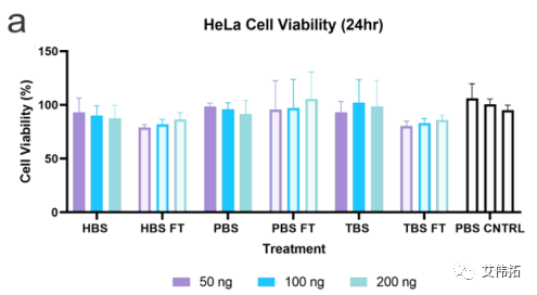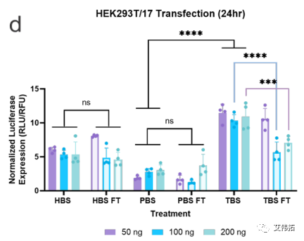 一般來說,所有的mRNA-LNP制劑在解凍后轉染效果都有所下降。在HeLa細胞中,PBS LNPs的轉染效率下降*為嚴重,在所有處理中平均下降4倍,而HEPES在所有處理中平均下降2倍(下圖b)。對于HEK293T/17細胞系, HEPES和PBS LNPs均無統計學意義的下降,而Tris在100和200 ng時的LNPs分別下降了2 ~ 2.5倍(下圖d)。