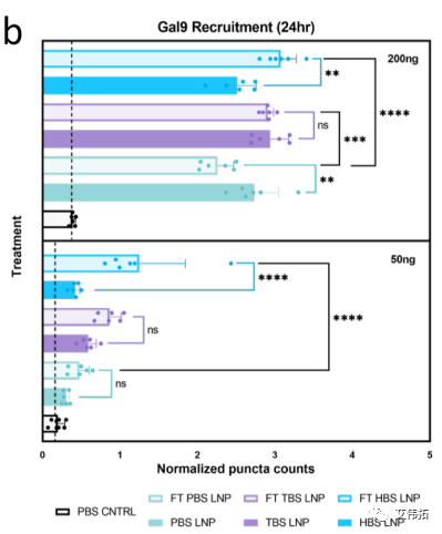 低劑量處理(50 ng)在所有新鮮LNPs中幾乎沒有變化,HEPES LNPs在FT后表現出**的Gal9募集和***的變化(2.6倍)。
