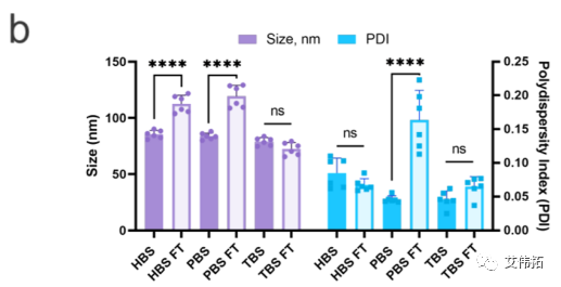 儲存在HEPES和PBS中的樣品在FT后的平均粒徑增大了約50%,而儲存在Tris中的LNPs的粒徑減小了約10 nm。
