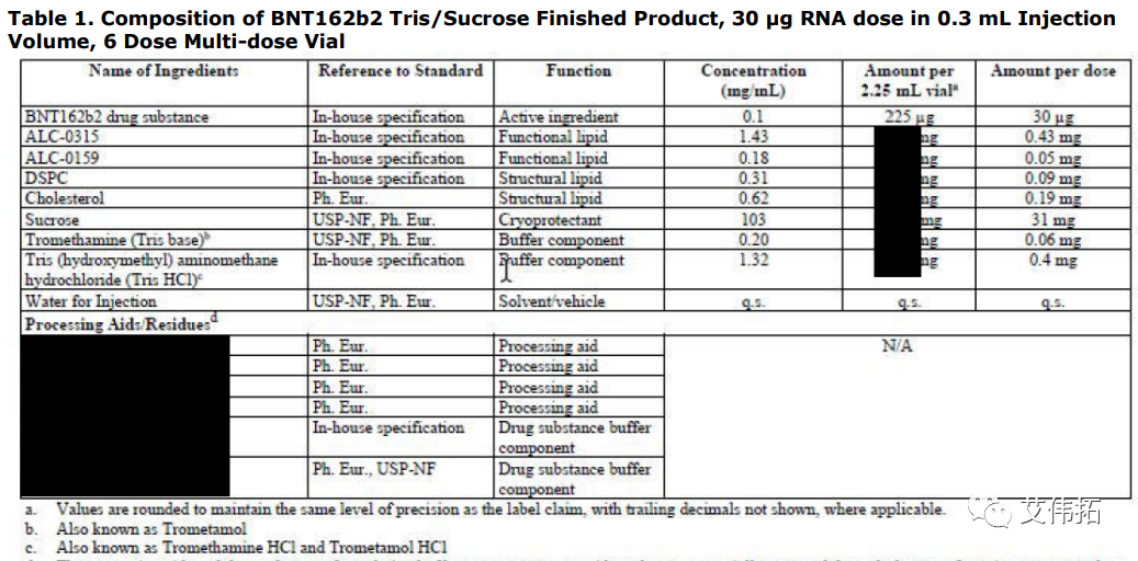 Pfizer /BioNTech的**疫苗在后續(xù)的變更中亦將其**中的磷酸緩沖體系替換為了Tris/Tris-HCl緩沖體系(變更后6劑量規(guī)格**如下)。上述信息說明Tris/Tris-HCl緩沖體系比磷酸鹽緩沖體系更適用于mRNA疫苗制劑。