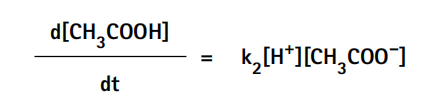 同樣地,醋酸的生成速率d[HAc]/dt取決于結合速率常數(k2)以及醋酸根離子和氫離子的濃度,可表示為: