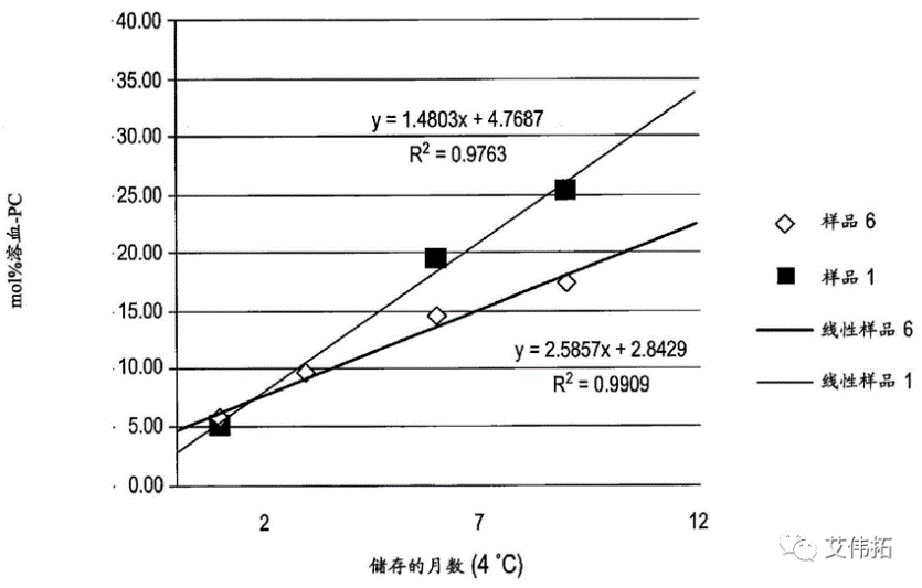 圖2 不同外水相pH下伊立替康脂質體長期儲存下溶血-PC的含量變化(樣品6為pH7.25,樣品1為pH6.5)