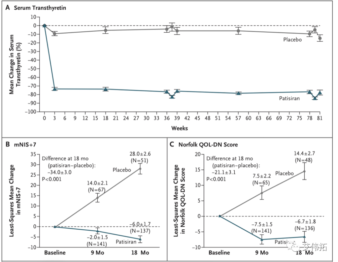 圖 A 顯示:patisiran 組和安慰劑組血清轉(zhuǎn)甲狀腺素蛋白水平隨時間推移相對于基線的百分比變化。