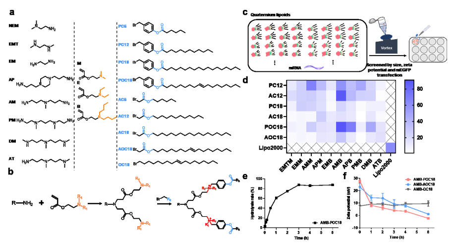(a) 用于脂化季銨合成的胺、丙烯酸酯和烷基化溴化物的列表。(b)類脂季銨的一般合成路線。(c) 脂質篩查示意圖。根據Hela細胞中的大小、Zeta電位和mEGFP轉染來評估信使核糖核酸/類脂復合物。(d) 在Hela細胞中24小時的信使核糖核酸/脂質復合物的EGFP表達譜(500ng-mEGFP,n=3)。(e) 通過高效液相色譜法(HPLC)測定AMB-POC18產生對羥基苯甲醇的水解動力學。(f) AMB-POC18、AMB-AOC18和AMB-OC18在37°C下存在100 U mL-1豬肝酯酶時的Zeta電位變化。