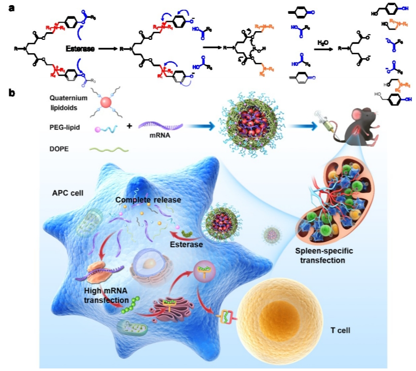 該文設計合成了一系列酯酶響應的去陽離子型季銨鹽類脂質分子用于構建具有高遞送效率、高儲存穩定性及**脾臟轉染性能的新型LNP。